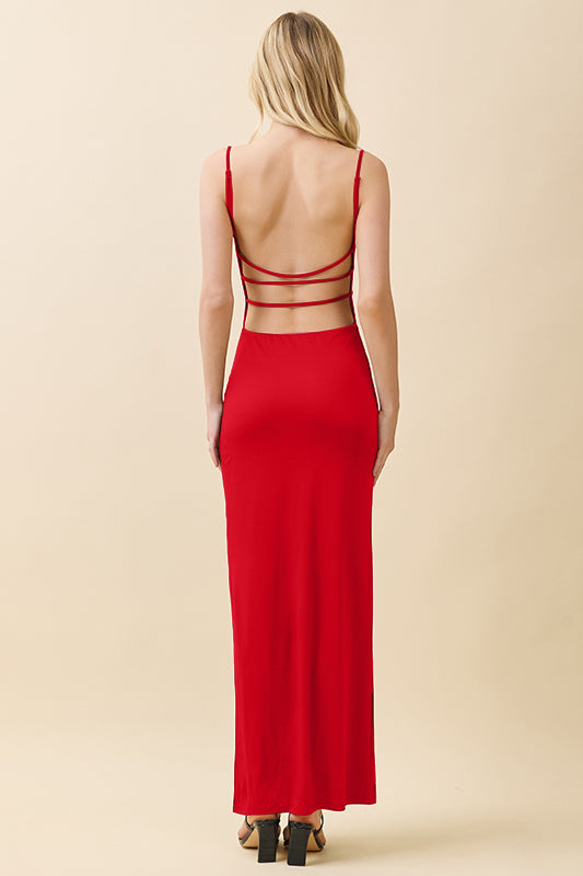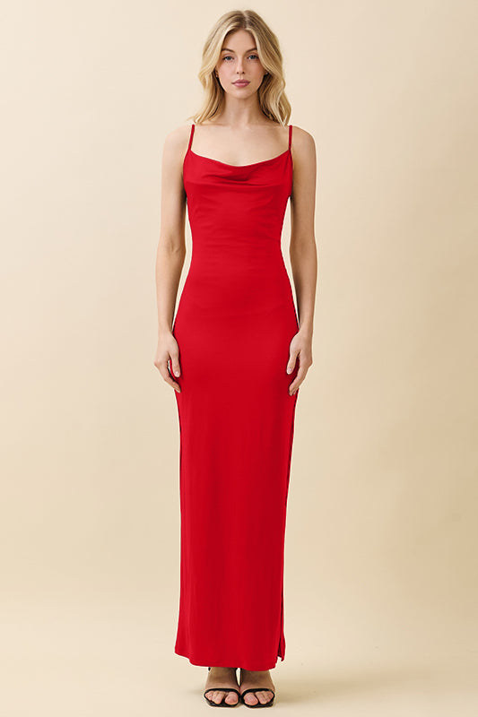 COWL NECK W LAYERED STRAP MAXI DRESS W SIDE SLIT