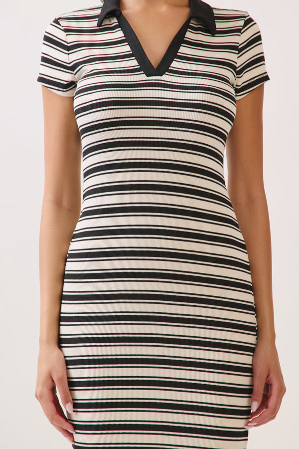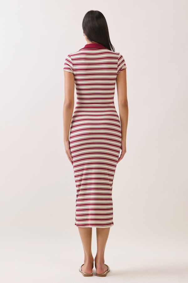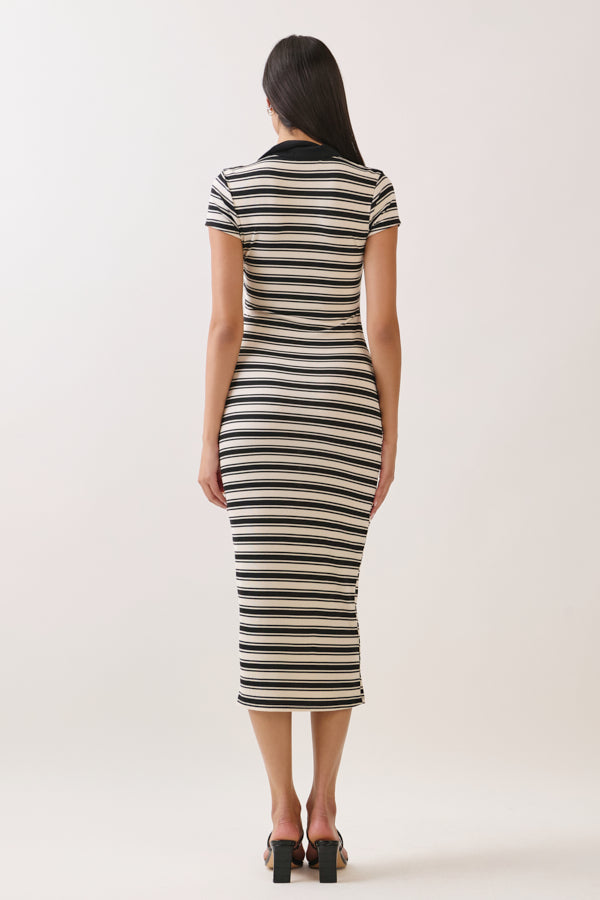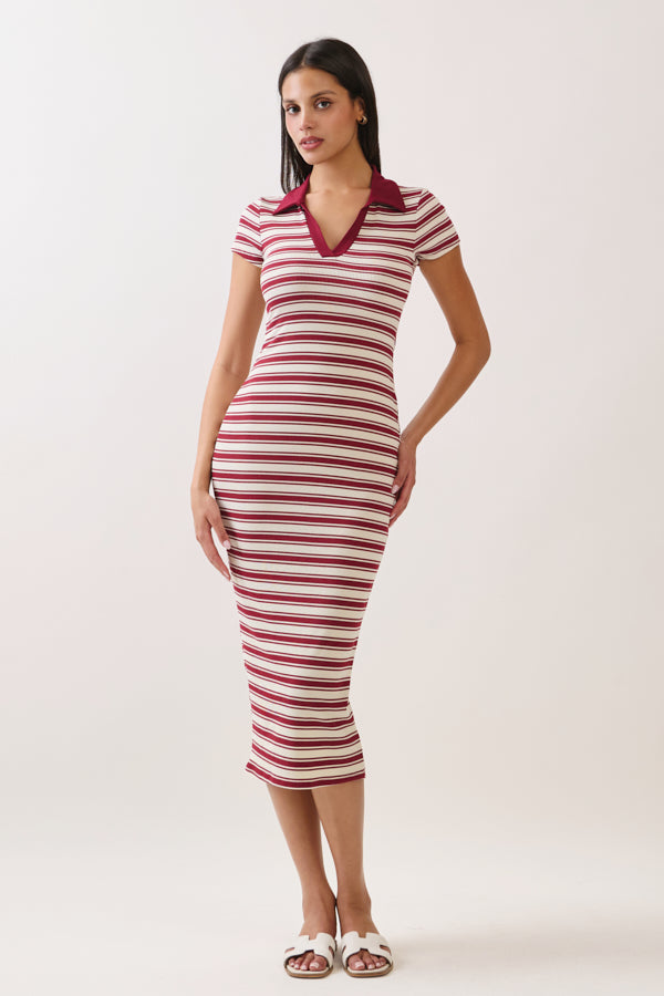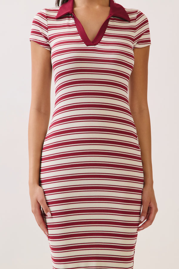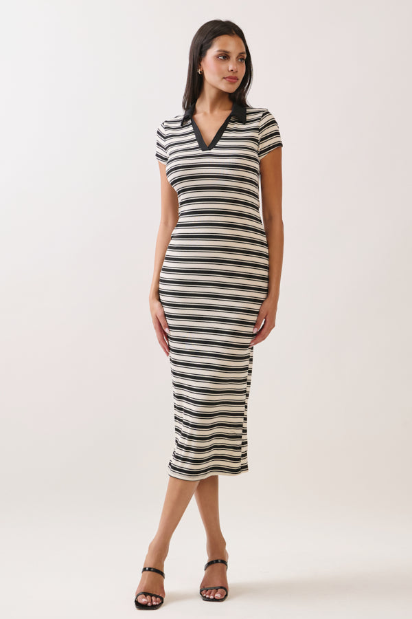 STRIPED JOHNNY COLLAR MIDI SHORT SLEVE DRESS