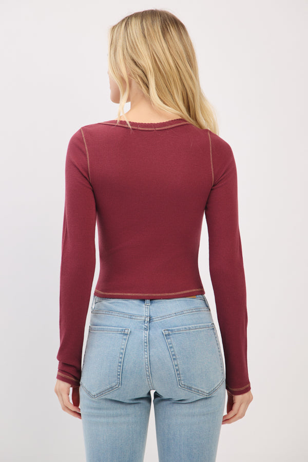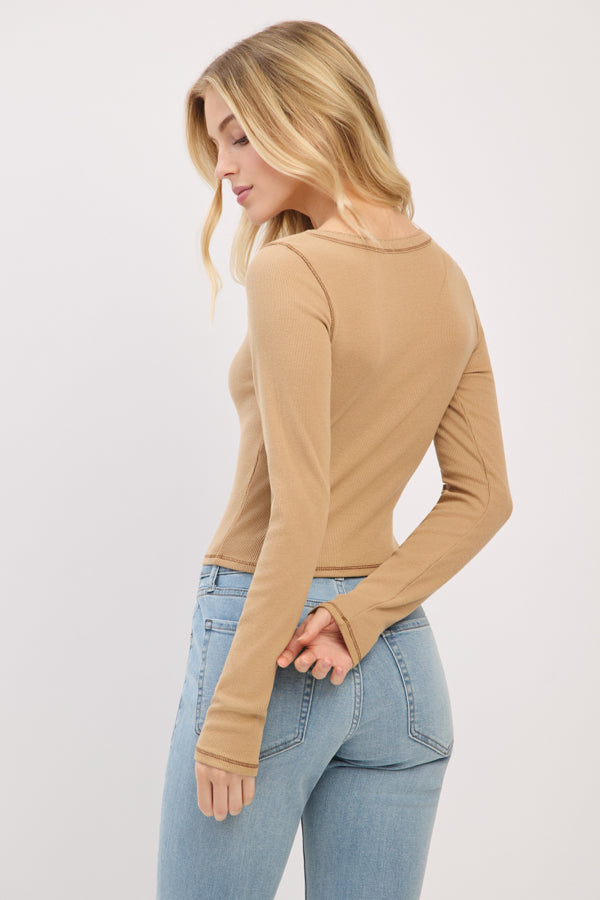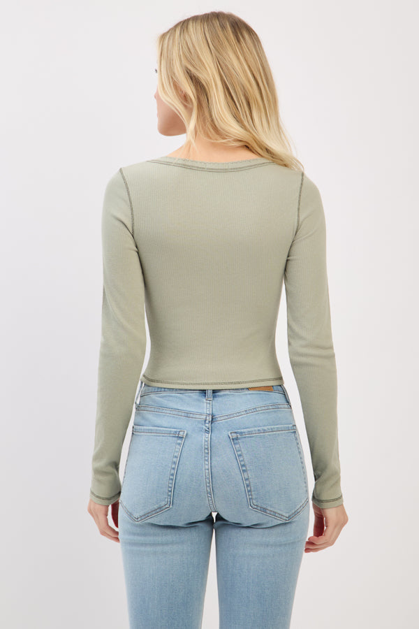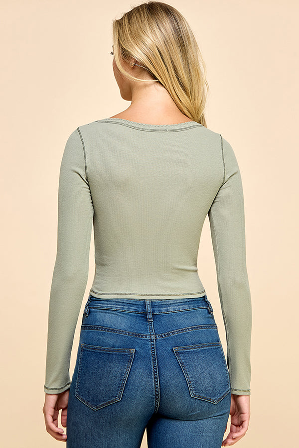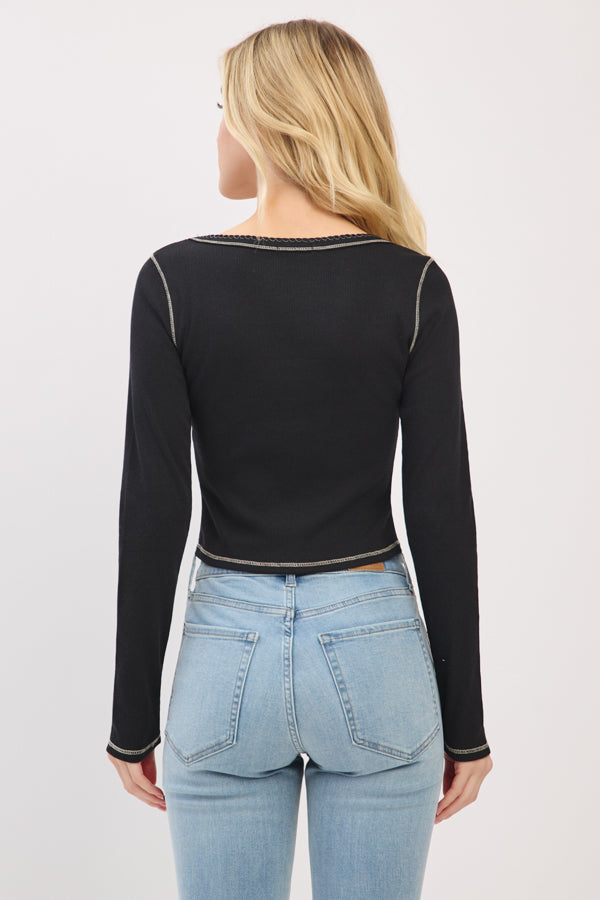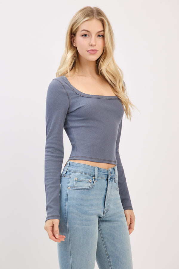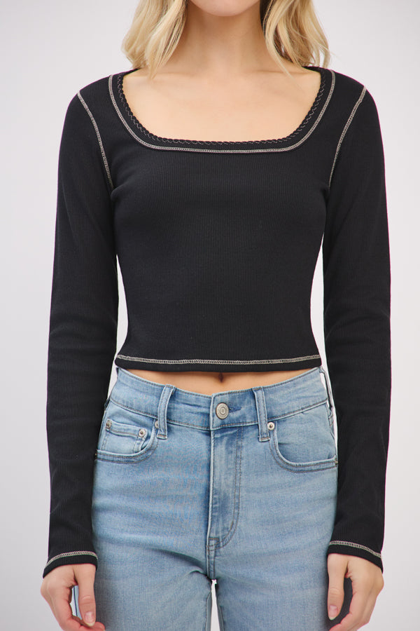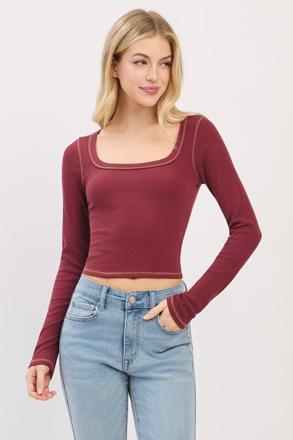 LONG SLEEVE SQUARE NECK RIBBED TOP W/ SCALLOP STITCH DETAIL