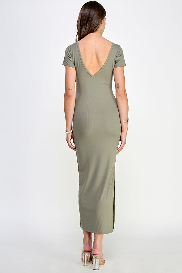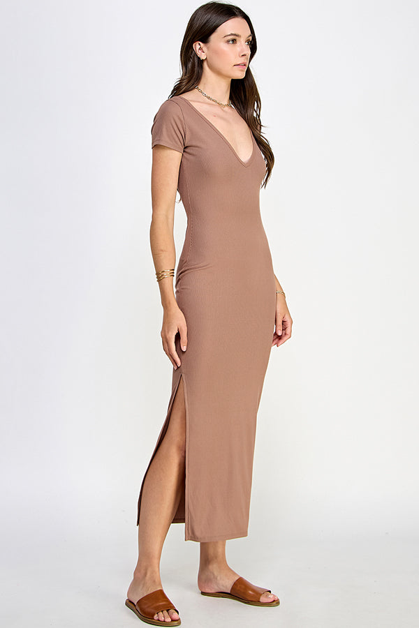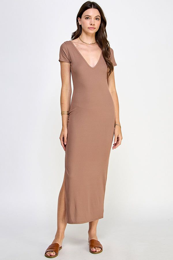 DOUBLE V-NECK RIBBED MAXI DRESS
