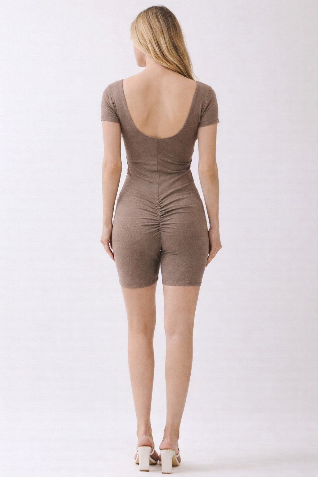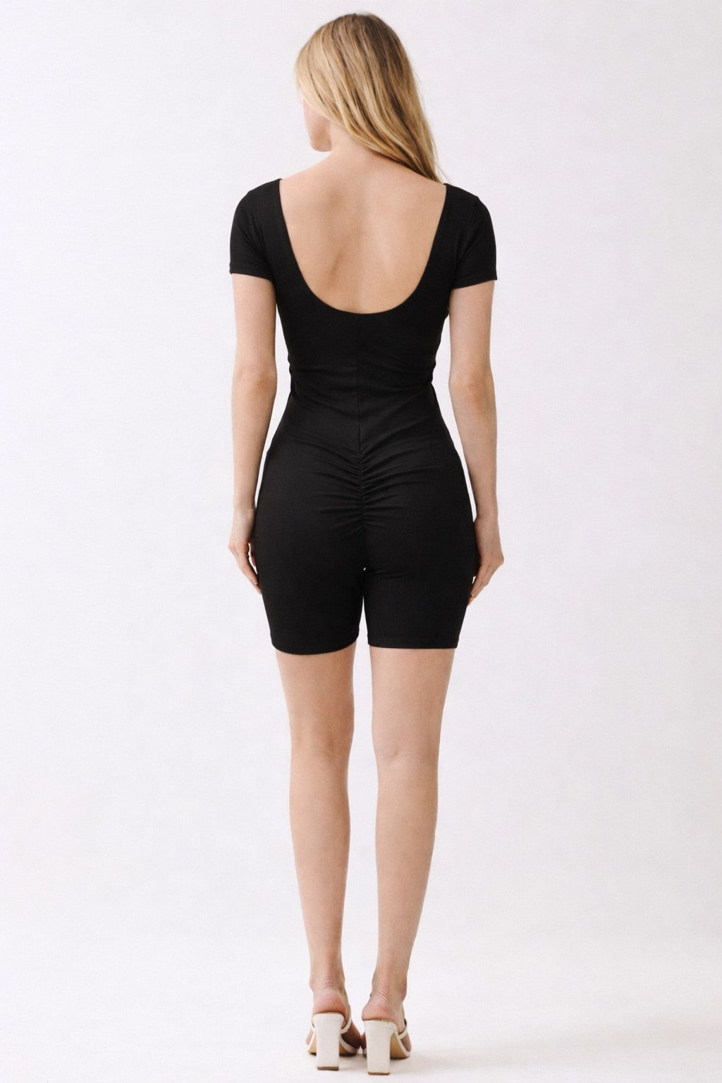 DOUBLE SCOOP SHIRRED BACK BIKER SHORT CATSUIT